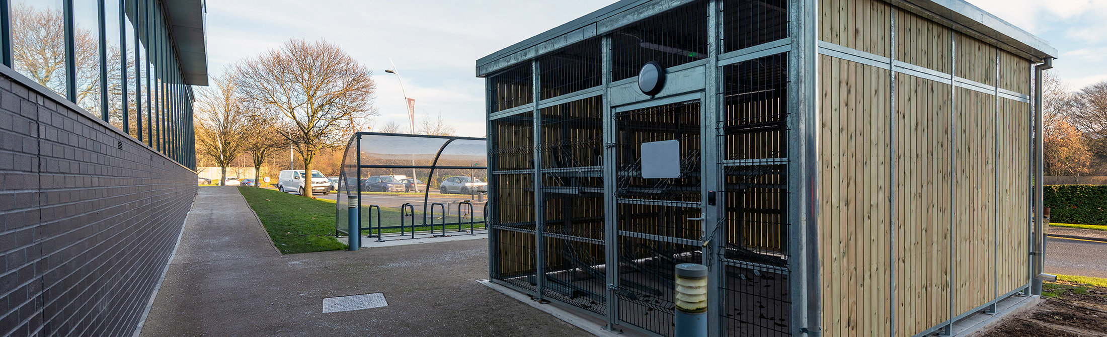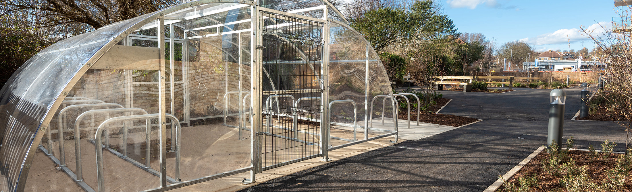 - Bike Shelters: Providing a covered bike parking facility, bike shelters are often combined with stands or racks with a single or double row system, while a semi-enclosed design can be supplemented with additional modules to form an enclosed bike shelter compound. However, it’s worth considering that limited options to enhance security beyond this means they are typically more fitting for enclosed sites and short-term parking where quick access for multiple users is a requirement.
