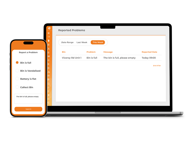 On the metroKEY user interface, the ‘report a problem’ button can be customised as required, with standard drop-down options such as bin full, bin requires cleaning, or unit damaged. Notifications are sent to administrators via the portal for action.