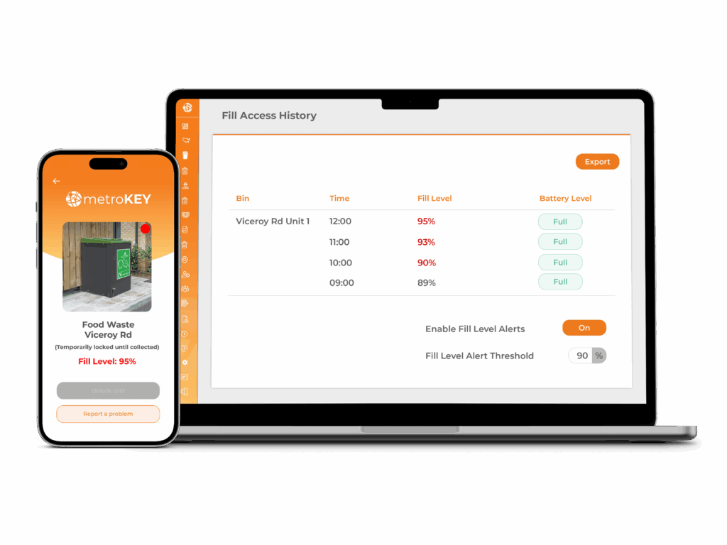 metroKEY can be integrated with smart bin fill sensors, enabling administrators to optimise collections by remotely monitoring fill levels across their network of drop-off facilities. This ensures bins are serviced only when required, reducing unnecessary vehicle movements and improving collection efficiency.